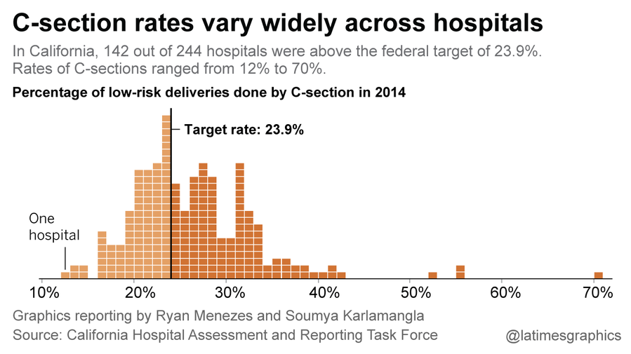 Hospitals calculate how often mothers considered low-risk for the procedure have C-sections. The NTSV rate includes only first-time mothers giving birth around their due date, having a single baby that’s positioned head down, the ideal position for delivery through the birth canal. In 2014, there were more than 160,000 NTSV deliveries in California, about 26% of which were C-sections.